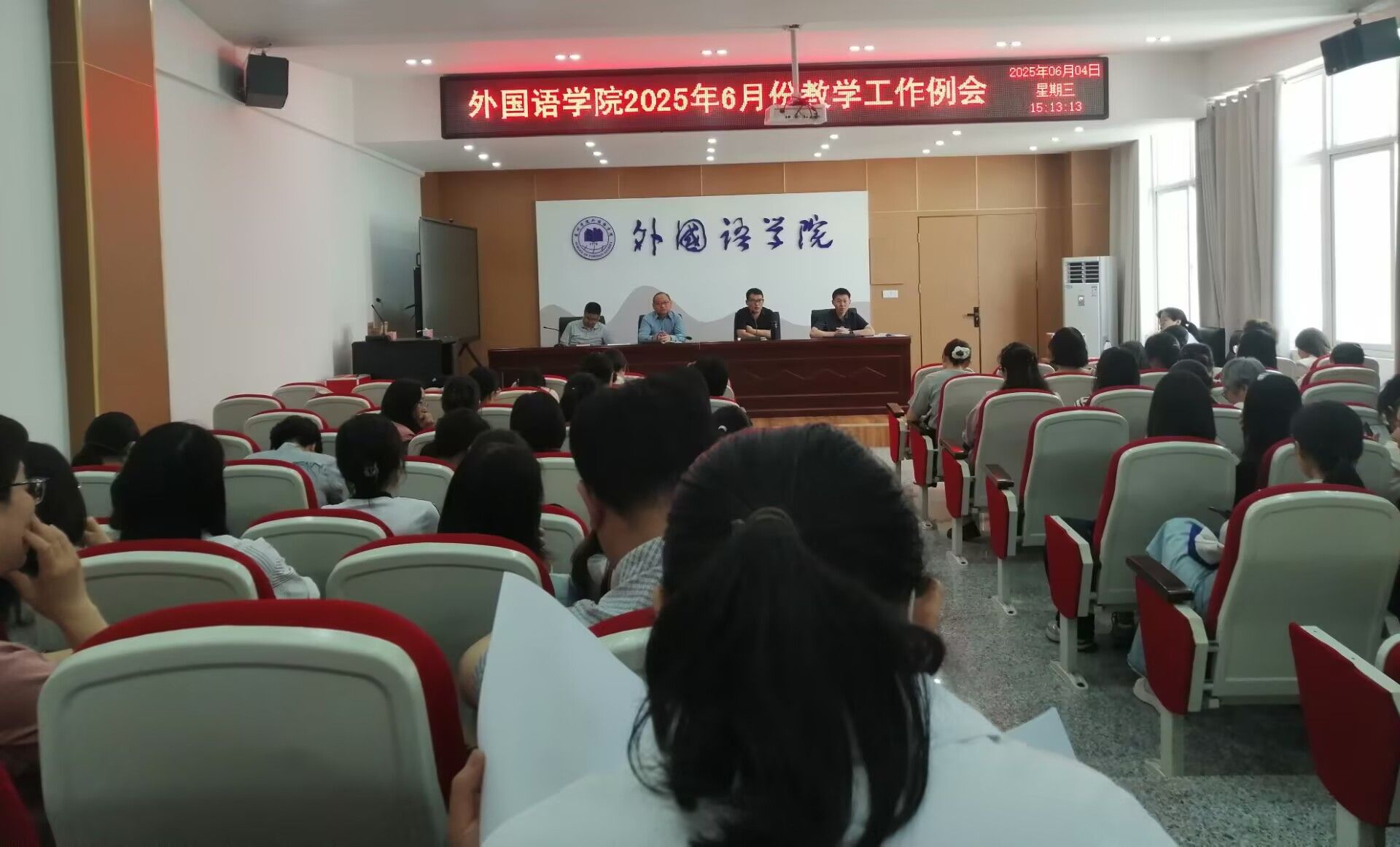 6月4日下午,在外国语学院一楼会议室召开6月份教学工作会议,全面部署期末及下学期教学重点工作。学院党委书记王金岭、副书记、院长胡永近、副书记、纪委书记刘钢、副院长宋皓及全体教职工参加会议。会议由胡永近主持。