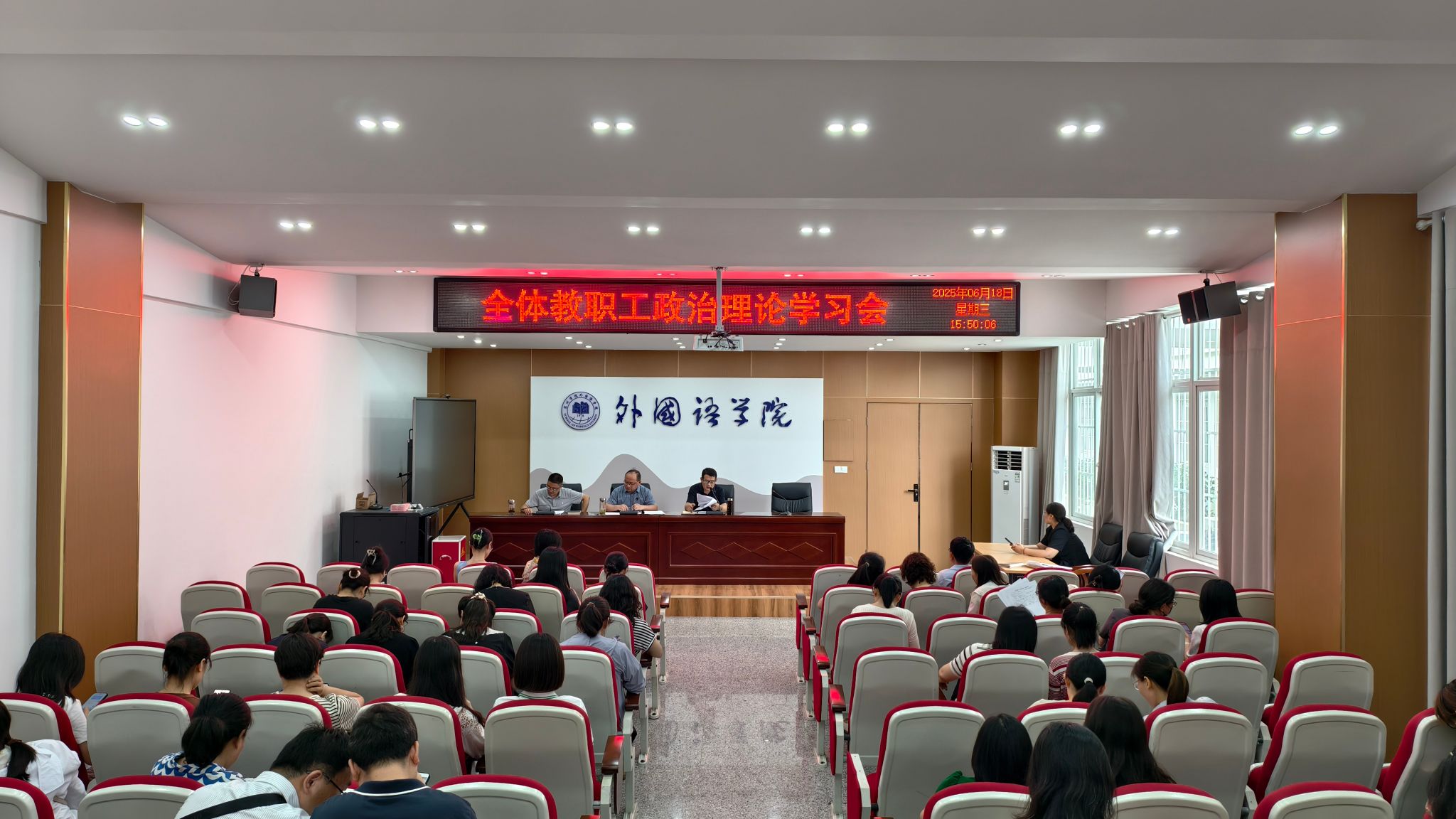 2025年6月18日下午,宿州学院外国语学院在逸夫楼一楼会议室召开6月份全体教职工政治理论学习会,会议由学院党委书记王金岭主持。
