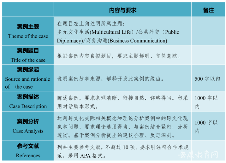 参赛团队提交视频,内容围绕“多元文化生活”、“商务沟通”和“公共外交”三个主题中的一个,共同开发编写跨文化交际案例,通过会话、访谈、角色扮演、情景剧等形式配合使用PPT进行案例展示,展示后运用跨文化交际理论知识进行案例分析并给出解决方案或建议。总时长不少于8分钟、不超过10分钟。视频须真人出镜,视频格式须为常见格式(推荐.mp4或.mov)。参赛案例由参赛团队自主开发编写,案例文本写作要求请参考下图: