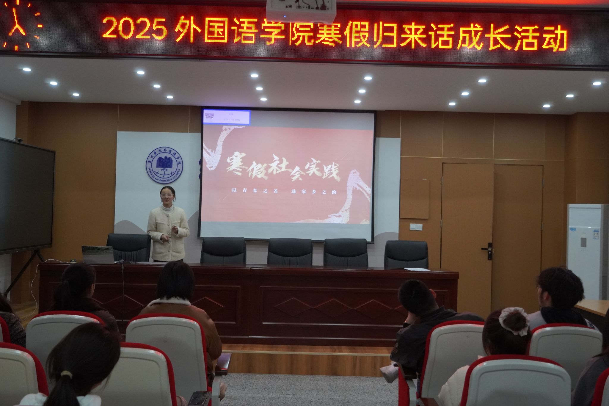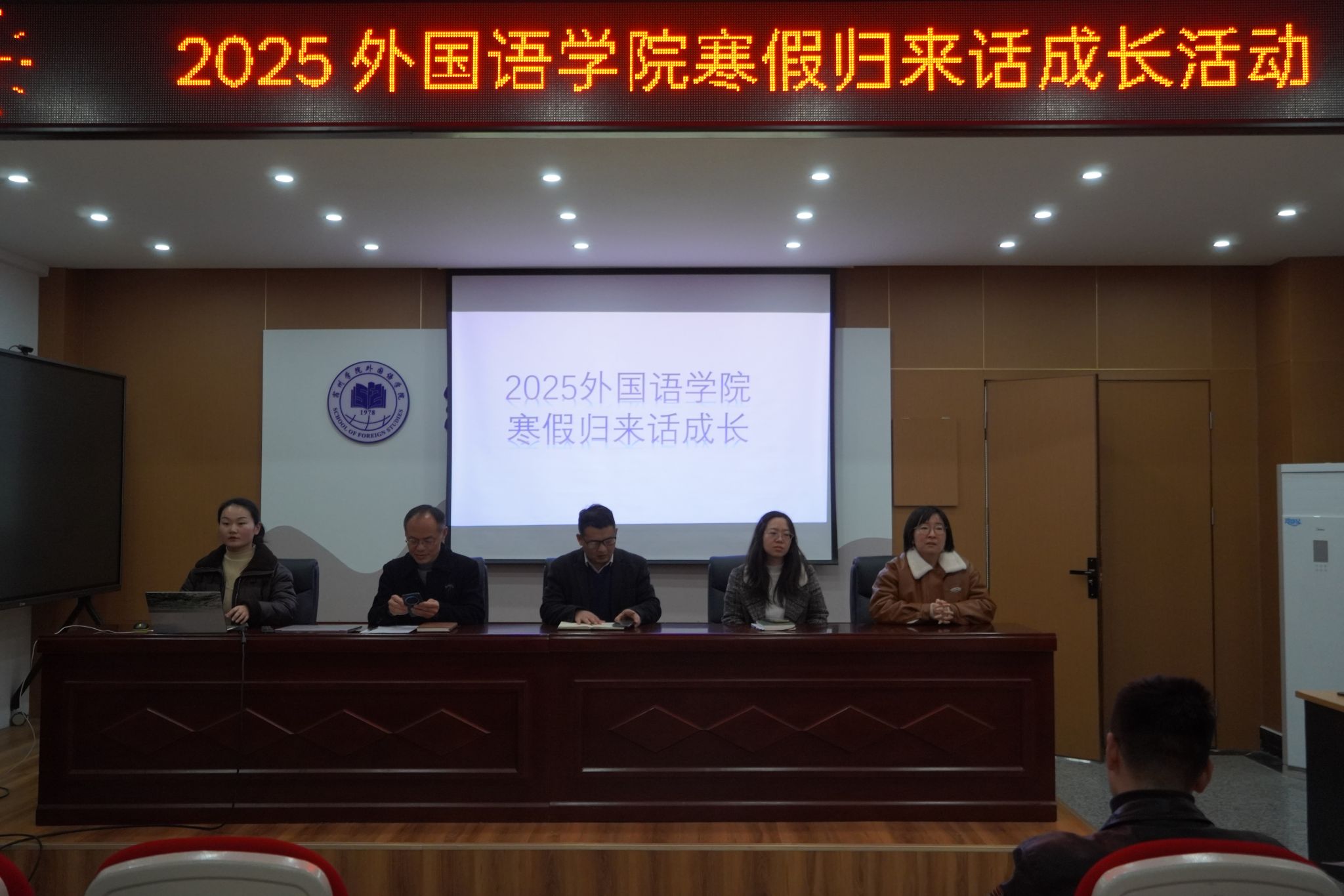 为深入落实立德树人根本任务,拓宽师生交流途径,同时强化学生社会责任感,外国语学院于3月14日下午在逸夫楼一楼会议室成功举办了2025年寒假归来话成长活动。本次活动由外国语学院分团委书记赵婷婷主持,党委书记郝景东、院长胡永近以及杨哲、余阳两位辅导员共同担任评委。