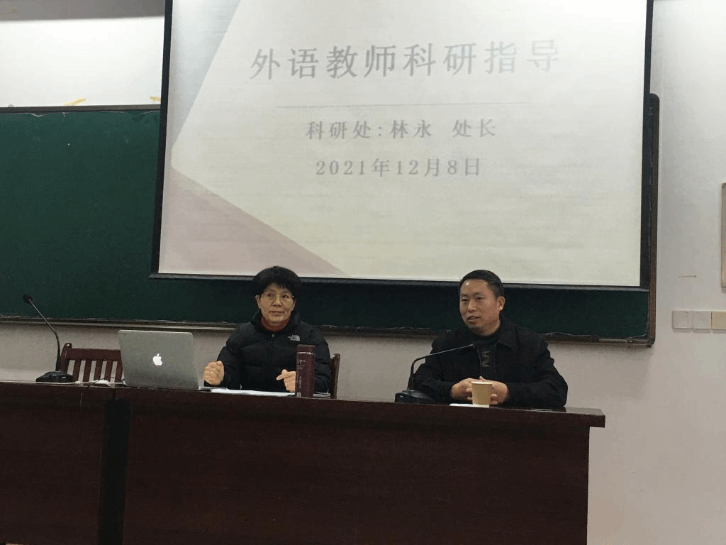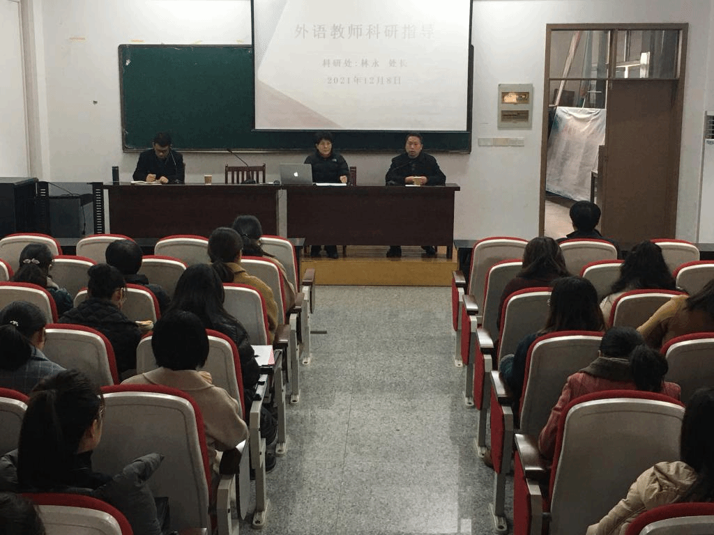 2021年12月8日,外国语学院邀请科研处林永处长莅临外国语学院检查指导科研工作,并为全院教职工作了“外语教师科研指导”学术报告。