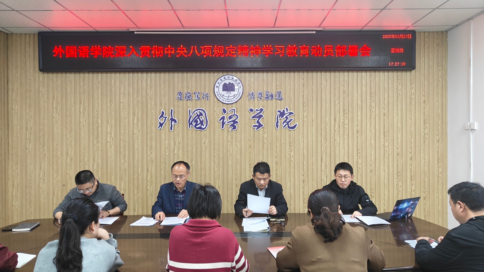 3月27日下午,外国语学院在逸夫楼A318会议室召开深入贯彻中央八项规定精神学习教育动员会。党委书记郝景东主持会议,学院党委委员、科级以上干部及党支部书记参加。