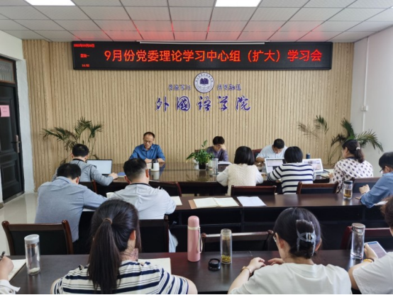 9月26日下午,外国语学院在逸夫楼A318会议室召开了党委理论学习中心组(扩大)学习会,学院党委委员、全体科级干部、教研室主任参加,会议由党委副书记(临时负责)郝景东主持。