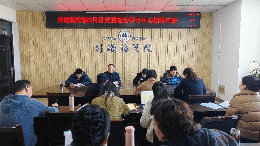 3 月 17 日下午,外国语学院在逸夫楼 A318会议室 召开3月份党委理论学习中心组学习会,会议由党委书记郝景东主持,学院党委委员、科级以上干部及党支部书记参加。