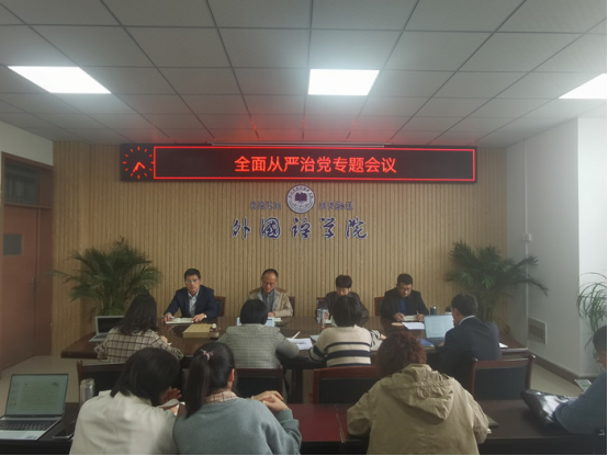 为深入学习贯彻落实十九届中纪委六次全会精神和教育系统全面从严治党工作部署,深化全面从严治党,4月18日下午,外国语学院召开全面从严治党工作会议。学院党委委员、科级以上干部及党支部书记参加,会议由党委副书记(临时负责)郝景东主持。
