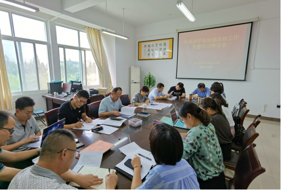 会上,与会人员围绕落实两个文件精神进行了深入交流研讨。党委副书记、纪委书记张亚锋传达了学院有关制度建设工作的文件要求,就开展学院规章制度“废改立”工作进行了安排布置。