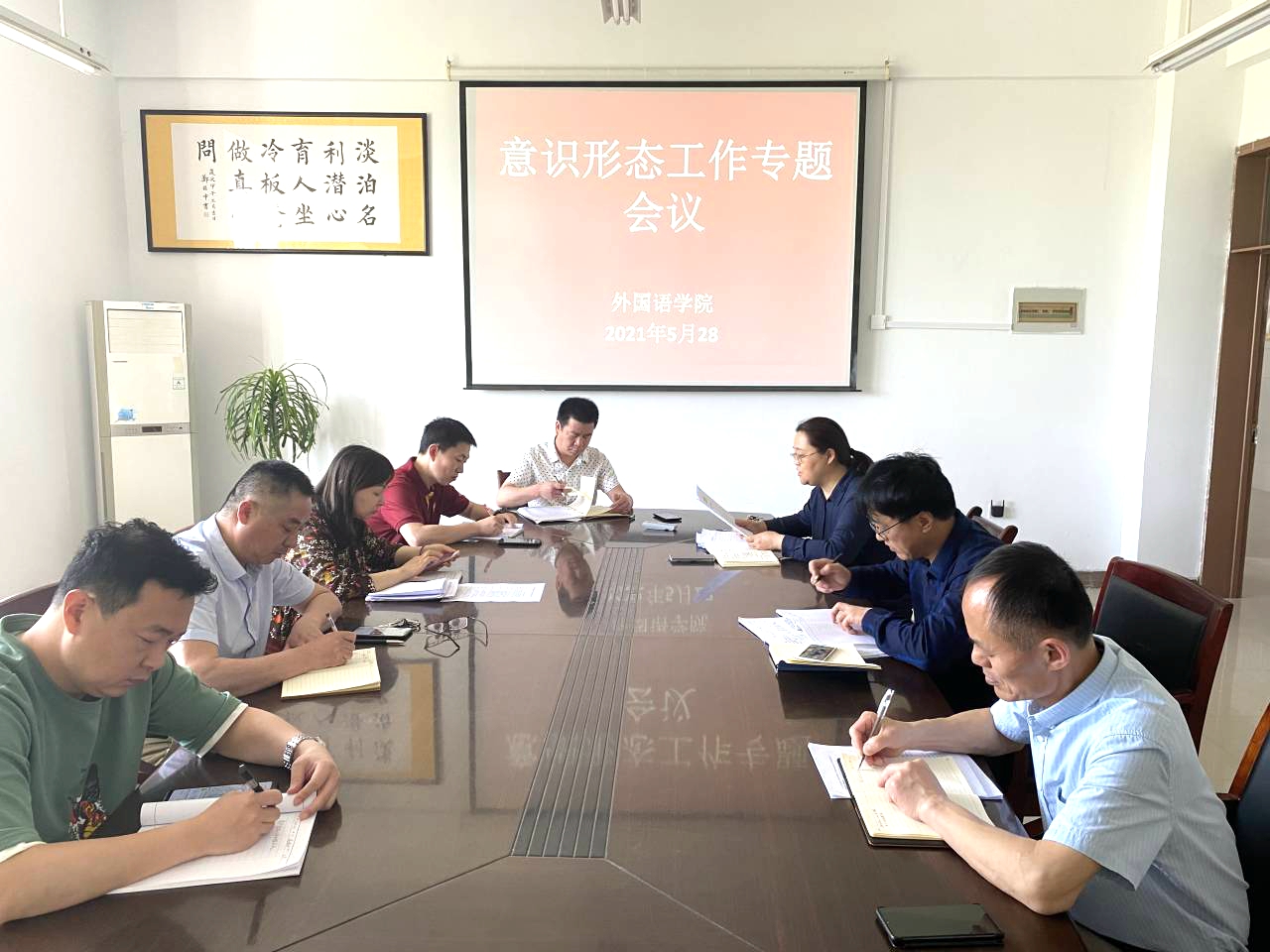 5月28日,外国语学院在逸夫楼A318会议室召开意识形态工作专题会议,院领导王华、李加强、郝景东出席会议,院意识形态工作领导小组成员、党支部书记、辅导员参加会议。会议由党委书记王华主持。