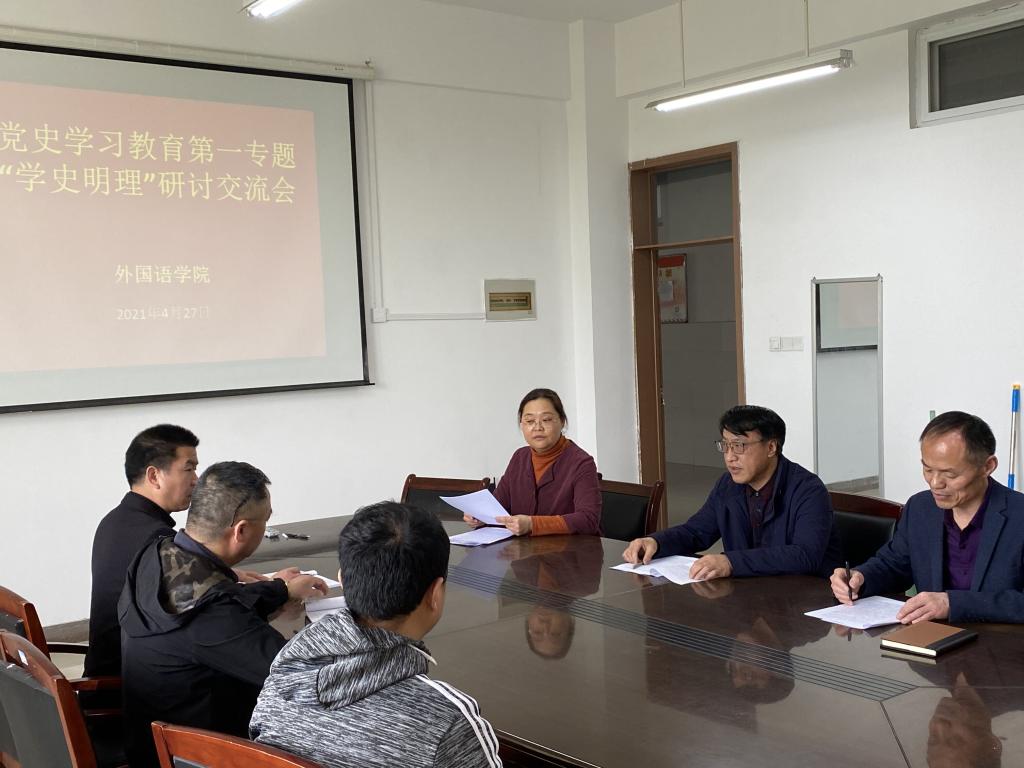 4月27日下午,外国语学院党委在逸夫楼A318会议室召开“学史明理”中心组学习研讨会。学院党委委员、领导班子成员参加了学习研讨,会议由院党委书记王华主持。