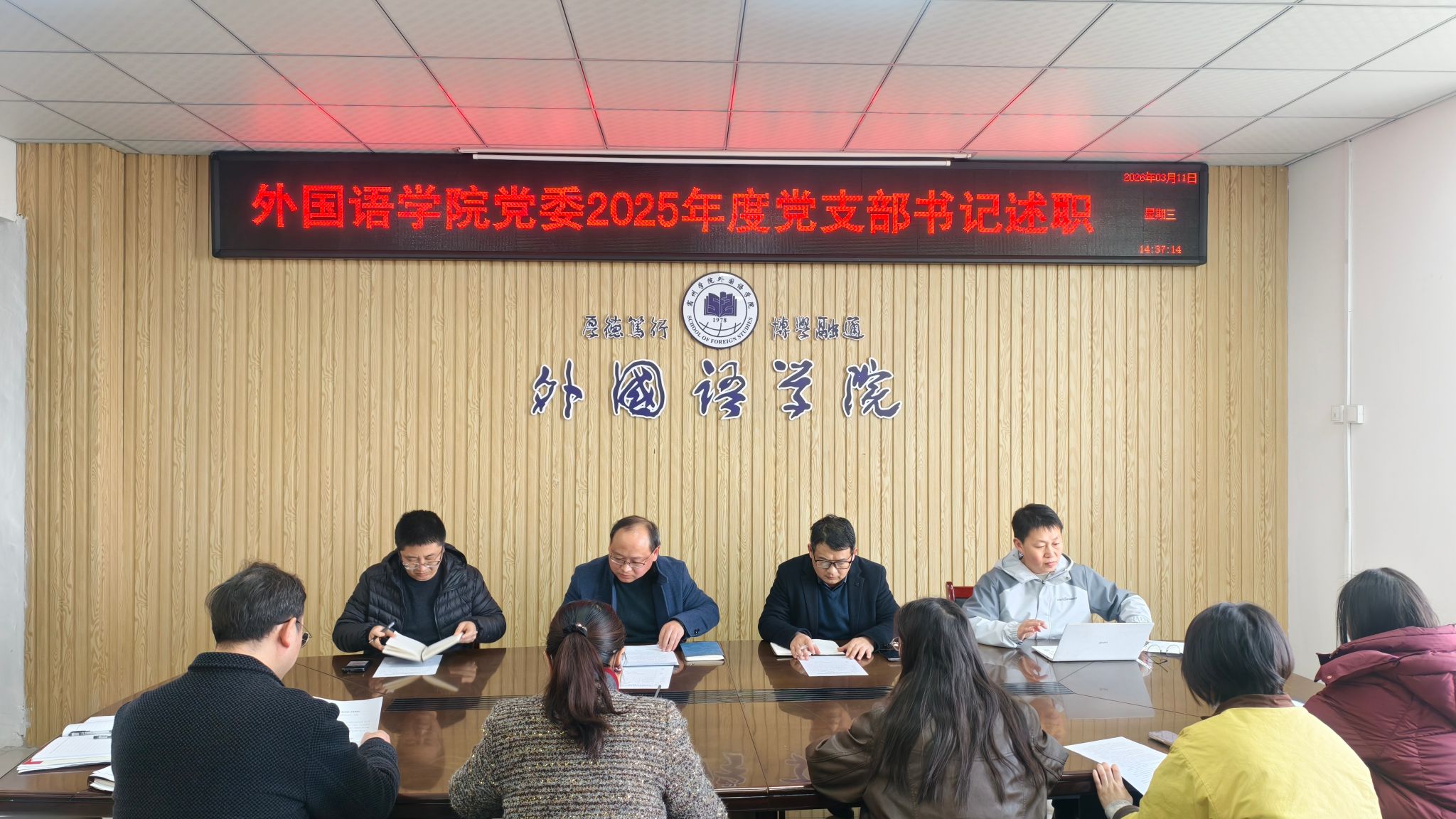 3月11日下午,外国语学院在逸夫楼A318室召开2025年度党支部书记述职评议会议。党委书记王金岭主持,学院领导班子、党委委员及全体党支部书记参加。