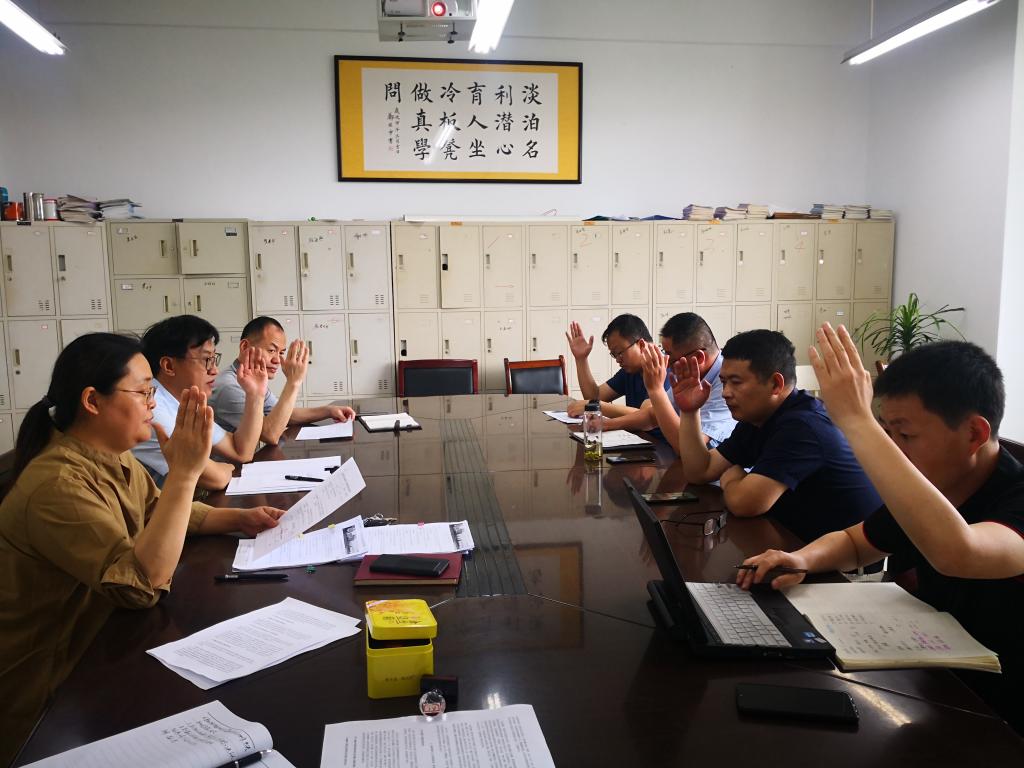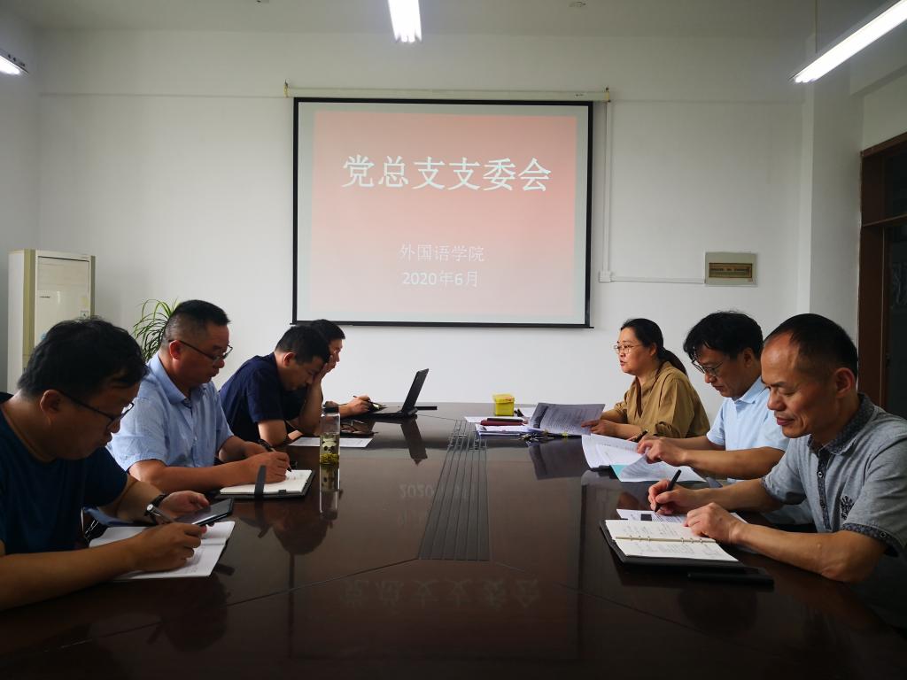 6月22日外国语学院党总支在逸夫楼A318办公室召开党总支支委会(扩大)学习会暨中心组理论学习会。党总支书记王华、院长李加强、党总支副书记、副院长郝景东、支委及支部书记参加会议。会议由党总支书记王华主持。