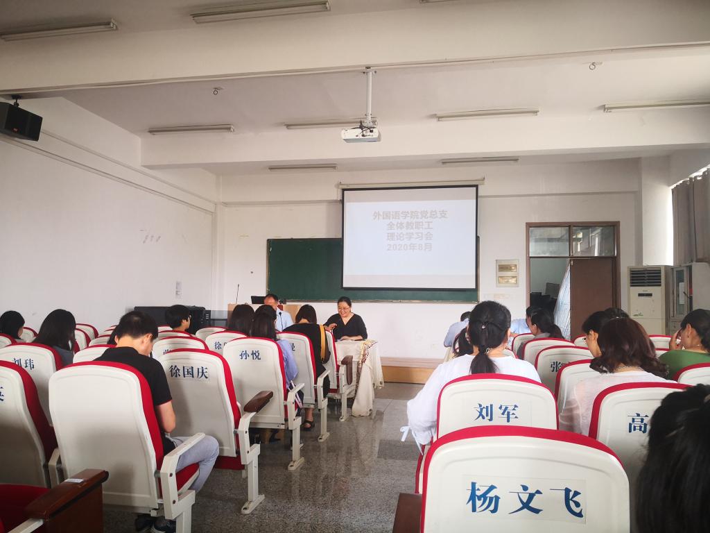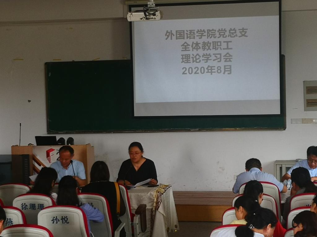 8月29日,外国语学院党总支在逸夫楼一楼会议室召开了学院全体教职工理论学习会。学院党政领导王华、李加强、郝景东及全体教师参加学习会。会议由党总支副书记郝景东主持。