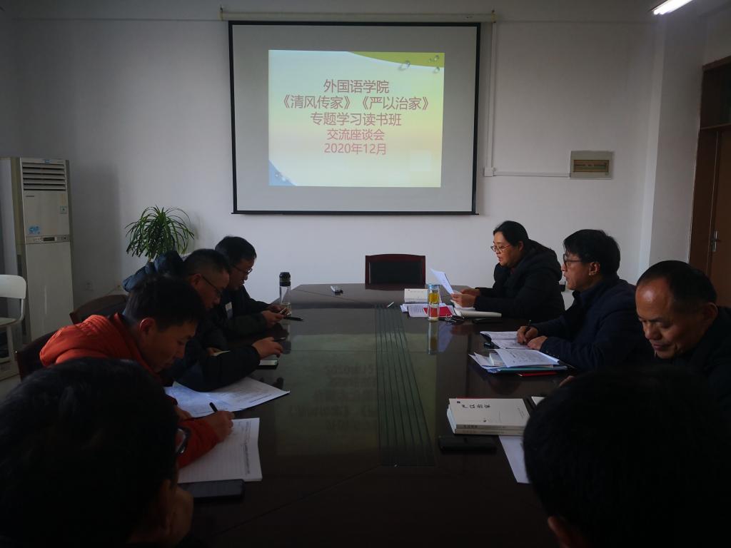 12月30日下午,外国语学院在318办公室召开《清风传家》《严以治家》专题学习读书班交流研讨会,学院党政领导、科级干部、党支部书记参加会议。会议由院党委书记王华主持。