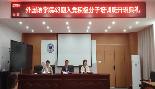4月28日下午,外国语学院在逸夫楼一楼会议室举办第43期入党积极分子培训班开班典礼,党委书记郝景东、学生支部书记赵婷婷以及第43期入党积极分子全体学员参加,开班典礼由专职组织员孙二平主持。
