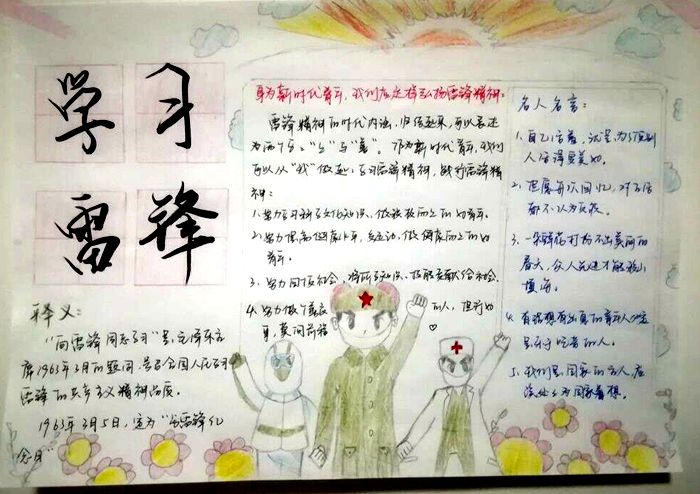 此次活动以“了解雷锋精神意义,践行雷锋精神魅力,服务他人奉献社会,构建和谐社会”为主题,进一步弘扬和传承雷锋精神。众所周知,雷锋精神是当代中国献给人类文明的先进成果,它充分体现了社会主义核心价值观的本质要求。雷锋精神更在本次疫情中大放光彩,那字字铿锵的请战书,那义无反顾的身影,那含有坚定信念的眼神,那一张张被口罩勒得伤痕累累的面孔等等,所有这些都是他们用实际行动诠释了雷锋精神。每年3月是雷锋月,在新时代的背景下学习雷锋精神,弘扬雷锋同志在热爱祖国、热爱社会主义的崇高理想和坚定信念,有利于提升我院同学的思想道德水平,引导其传承中华民族传统美德,形成奋发向上的精神力量,从而一心一意刻苦学习,掌握科学文化知识,进一步实现中华民族的伟大复兴,都具有十分重要的意义。此次手抄报活动选出荣婉玲、刘欣妍、朱亚玲共三位同学的优秀作品,从他们的作品中更加清晰直观地展示出更形象化的雷锋精神。任何时候,雷锋同志身上助人为乐、爱岗敬业、积极进取、勤俭节约的品质都是我们不断学习的要素。雷锋精神是不受时空限定的,无论现代科技怎样发达,无论人们的生存方式怎样改变,雷锋对世界和他人真诚的爱心永远是人间渴求的那种温暖,像阳光一样成为人类永恒的需要。