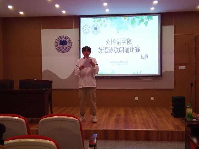 作为第十二届“英语月”活动之一,5月13日外国语学院爱国主义英文诗歌朗诵比赛院级初赛在逸夫楼一楼会议室举行。