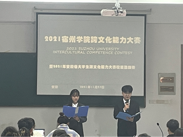 为了“讲好中国故事,传播好中国声音”,也为了锻炼了宿州学院大学生的语言能力,11月24日下午,我校在逸夫楼一楼会议室成功举办了2021年安徽省大学生跨文化能力大赛校内选拔赛。此次选拔赛面向我校全日制本科在读学生,并分为日语组和英语组,共24支参赛队伍,由外国语学院谢冰老师、外教Michael老师以及宿州学院首届跨文化能力大赛冠军组成员、17英语专业同学张肖林担任评委。