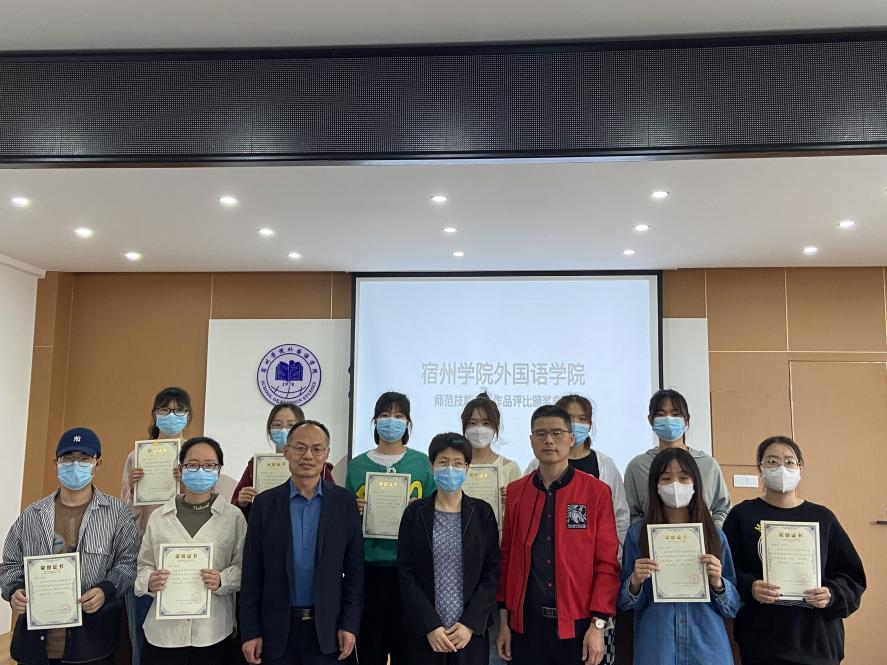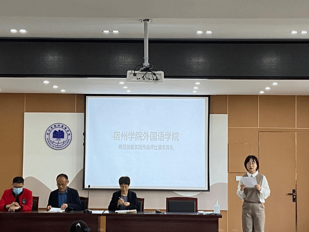 为巩固和提高师范类学生的师范技能应用能力,根据师范专业认证标准体系中的培养目标和毕业要求,外国语学院开展了为期两周的师范生技能实践。4月21日下午,首届师范生技能实践作品评比颁奖典礼在逸夫楼一楼会议室举行,分团委书记赵婷婷担任主持,外国语学院院长张雁凌、党委副书记(临时负责)郝景东、党委副书记张亚锋出席此次典礼。