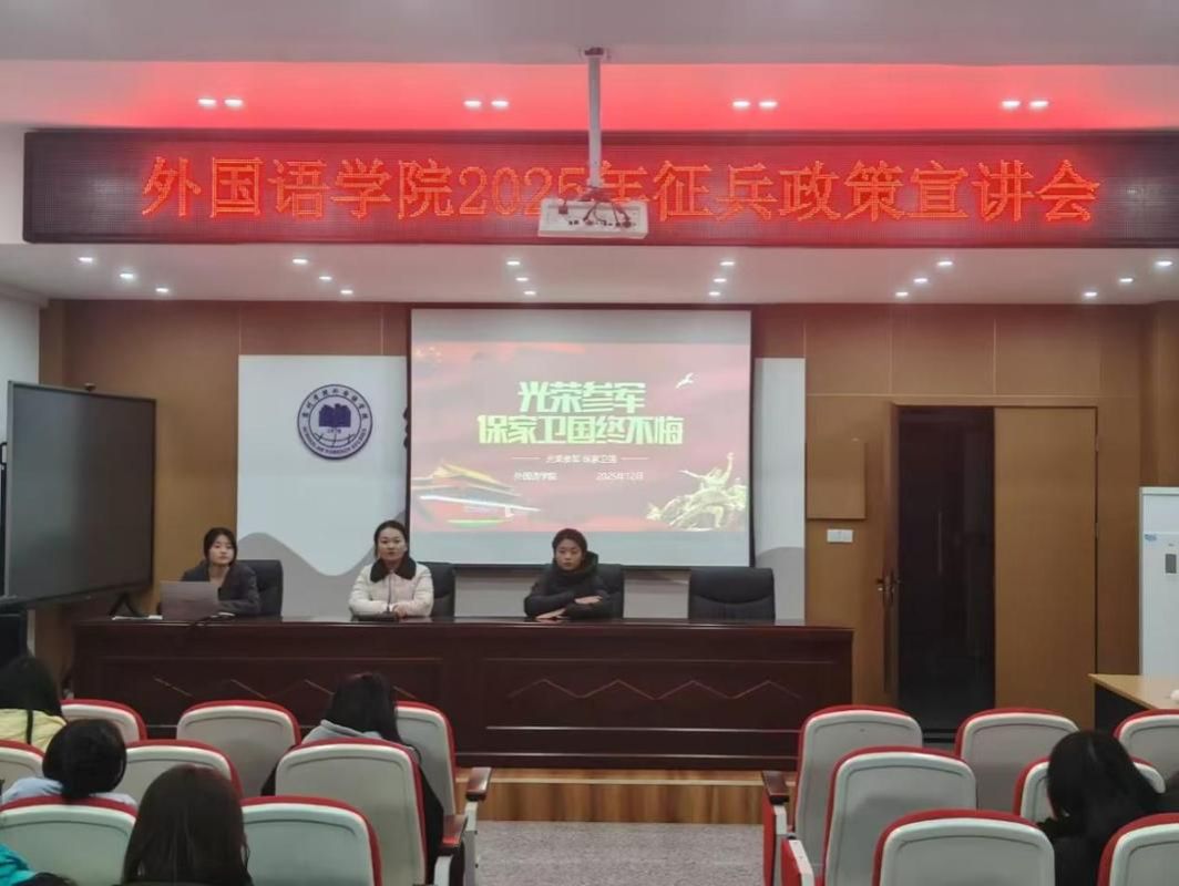 为积极响应国家征兵号召,鼓励青年学子携笔从戎、报效祖国,12月9日下午,外国语学院在逸夫楼一楼会议室举办征兵政策宣讲会。本次活动由辅导员杨哲主持,学院征兵宣传大使张洁、贾瑞熙担任主讲,众多有意向参军的学生到场参加。