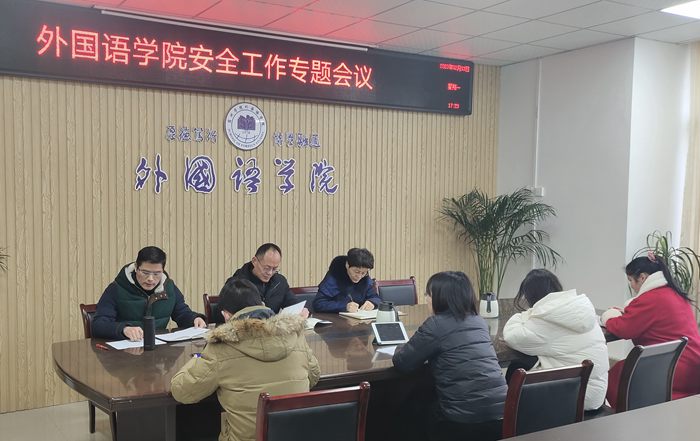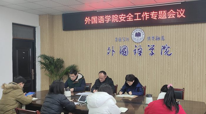 为贯彻落实学校安全工作会议精神,2月13日下午,外国语学院在在逸夫楼A318会议室召开了2023年春季安全工作会议。会议由学院党委书记郝景东主持,院长张雁凌,副书记张亚锋出席会议,学生工作团队成员参加会议。