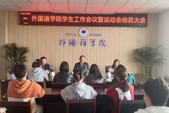 10月25日下午,外国语学院召开学生工作专题会议,会议由党委副书记(临时负责)郝景东主持,学生事务管理科宋皓老师、分团委书记赵婷婷老师、全体辅导员(班主任)以及各班体育委员等参加。