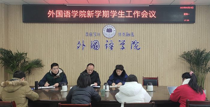 为落实学校学生工作会议精神和要求,确保2023年春季学期学院学生工作的平安有序开展,2月13日下午,外国语学院在318会议室召开了新学期学生工作会议。会议由党委书记郝景东主持,院长张雁凌、副书记张亚锋出席会议,学院全体辅导员参会。