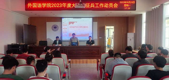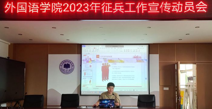 为积极响应国家对大学生的征兵入伍号召,全面做好2023年春季征兵宣传工作,落实学校2023年大学生征兵入伍工作的部署安排,5月15日下午,外国语学院在逸夫楼一楼会议室召开了征兵动员大会,学生干部、全体男生参加大会,学院党委副书记张亚锋做动员报告。