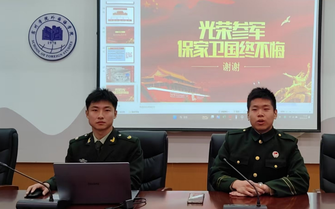 为进一步加强征兵宣传工作,鼓励在校学生投身火热军营,献身国防事业,外国语学院于12月4日中午在逸夫楼一楼会议室举办了学长沙龙第十期:优秀退役大学生士兵经验分享会暨征兵宣讲会。征兵宣传大使仝道龙、刘昌赫进行了专题宣讲。