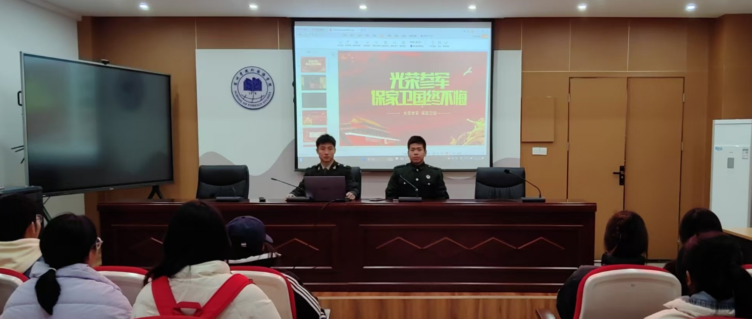 学生事务管理科宋皓老师首先对征兵项目进行了总体的介绍,传达了学校《关于做好我院2025年春季征兵工作的通知》精神。仝道龙和刘昌赫向同学们宣传了大学生入伍的条件及相关优惠政策,讲述了自己的军旅故事,分享了“携笔从戎、参军报国”的点点滴滴,鼓励大家一心向党、一心为党,积极参军报国,在强军梦的伟大实践中挥洒热血,书写无悔青春。