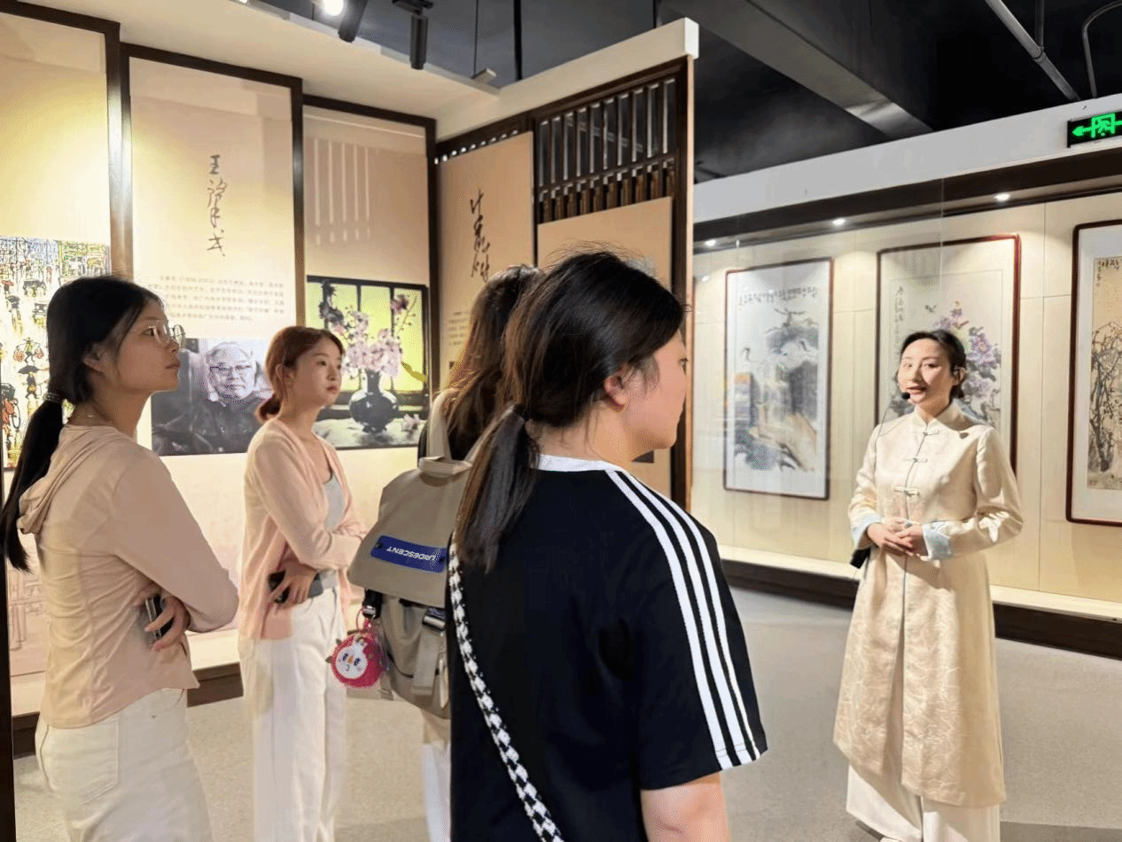 活动的第二站,师生们步入皖北文化艺术馆,在讲解员的带领下开启一场“文化寻根之旅”。展厅内,灵璧钟馗画的粗犷线条、泗州戏服饰的斑斓刺绣、萧县农民画的质朴构图,共同勾勒出皖北大地独有的艺术图谱。讲解员以“一物一故事”的叙事方式,将非遗技艺背后的匠心传承、民俗节庆中的烟火气息娓娓道来,让抽象的文化符号变得可触可感。面对展柜中泛黄的木版年画,学生朱晓语感叹:“这些民间艺术就像散落的珍珠,串联起皖北人民的智慧与生活。作为外语专业的学生,我更有责任把这些故事翻译给世界听。”