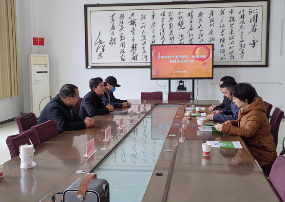 为了全面理解外语课程思政,提升大学英语课程思政教学水平,进一步推进大学外语和中学外语课程思政一体化工作,外国语学院于2023年3月21日赴埇桥区格瑞学校召开课程思政研讨会。外国语学院科研副院长胡永近,实习实训中心主任王培培、分团委书记赵婷婷、杨曼博士参加了会议,格瑞学校校长刘攀、教学副校长常志坚、初中部副校长张己伟、常务副校长郭峻利等参加了会议并分享外语课程思政方面的教学经验,会议由刘攀主持。
