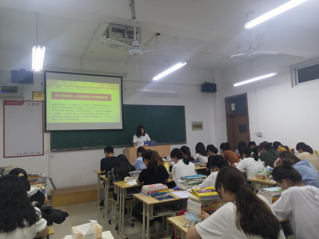 活动伊始,2班团支部书记宣布大会开始,全体起立,奏团歌。此次活动由2班团支书凌馨璐同学主持,她的认真准备,确保了活动的顺利进行。通过一起观看历史视频资料,大家对党史有了更加明晰的认识,期间同学们态度端正。视频结束后,主持人向大家重点介绍了党史的时间脉络和学习党史的意义。此外主持人还围绕此次主题进行了提问,同学们踊跃发言,掌声不断,此次活动在热烈激昂的氛围中取得圆满结束。