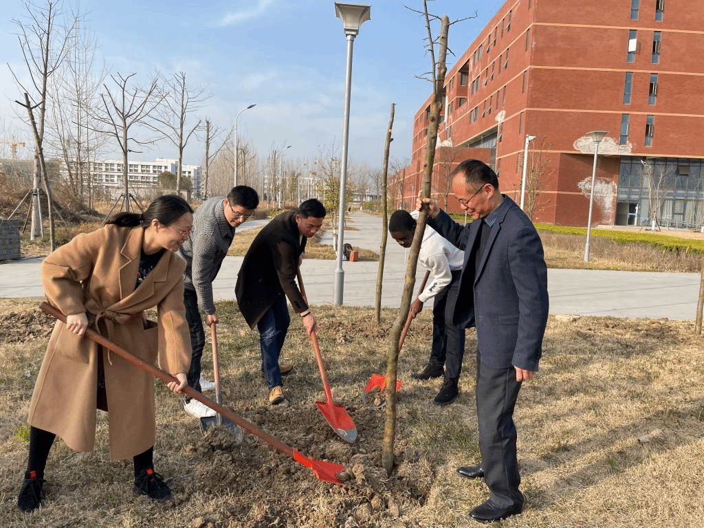 为庆祝第44个“3·12”义务植树节,营造全民动员、人人参与的良好氛围,外国语学院党委副书记(临时负责)郝景东、党委副书记张亚锋和学生党支部书记赵婷婷、余阳,外教老师 Thierry与学生一道开展了义务植树造林活动。
