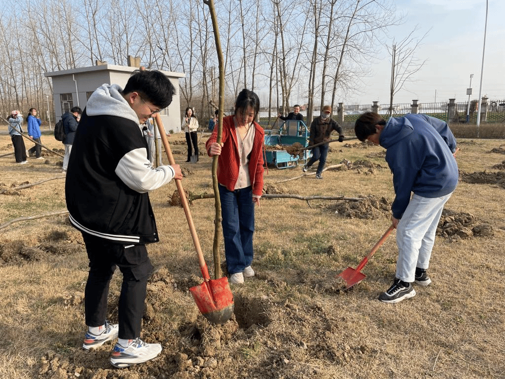此次义务植树活动在教育园区校区实习实训楼附近的空地集中进行。外国语学院的师生们配合默契,有的扶植树苗、有的挥锹铲土、有的培土固根、有的提水灌苗,大家齐心协力、干劲十足,空地转瞬成林。现场欢声笑语,洋溢着团结协作、昂扬向上的融洽氛围,一派热火朝天的春日劳动景象。