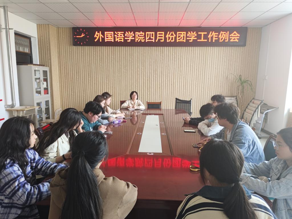 为促进学院团学工作顺利开展,提高团学工作的质量和效率,4月8日外国语学院分团委在逸夫楼314会议室召开4月团学工作例会。会议由分团委书记赵婷婷主持,学生会各部门负责人、学院指导社团负责人和部分团支书代表参加了本次会议。