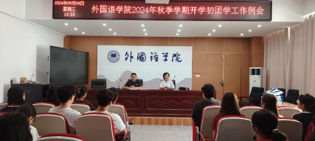 为进一步明确新学期团学工作目标,凝聚学生组织力量,推动学院团学工作顺利开展,9月4日上午,外国语学院在一楼会议室召开2024年秋季学期开学初团学工作例会。此次会议由学院分团委书记赵婷婷主持,学院党委副书记刘钢以及分团委、学生会、学院社团主要学生干部和班级干部参加了会议。