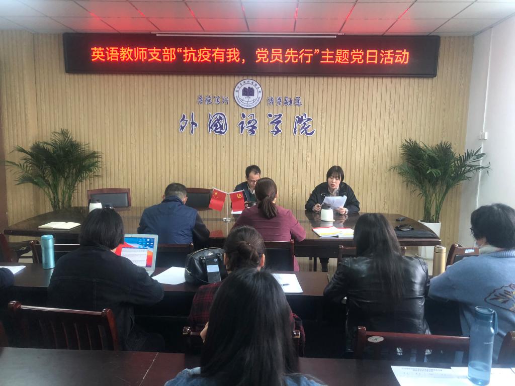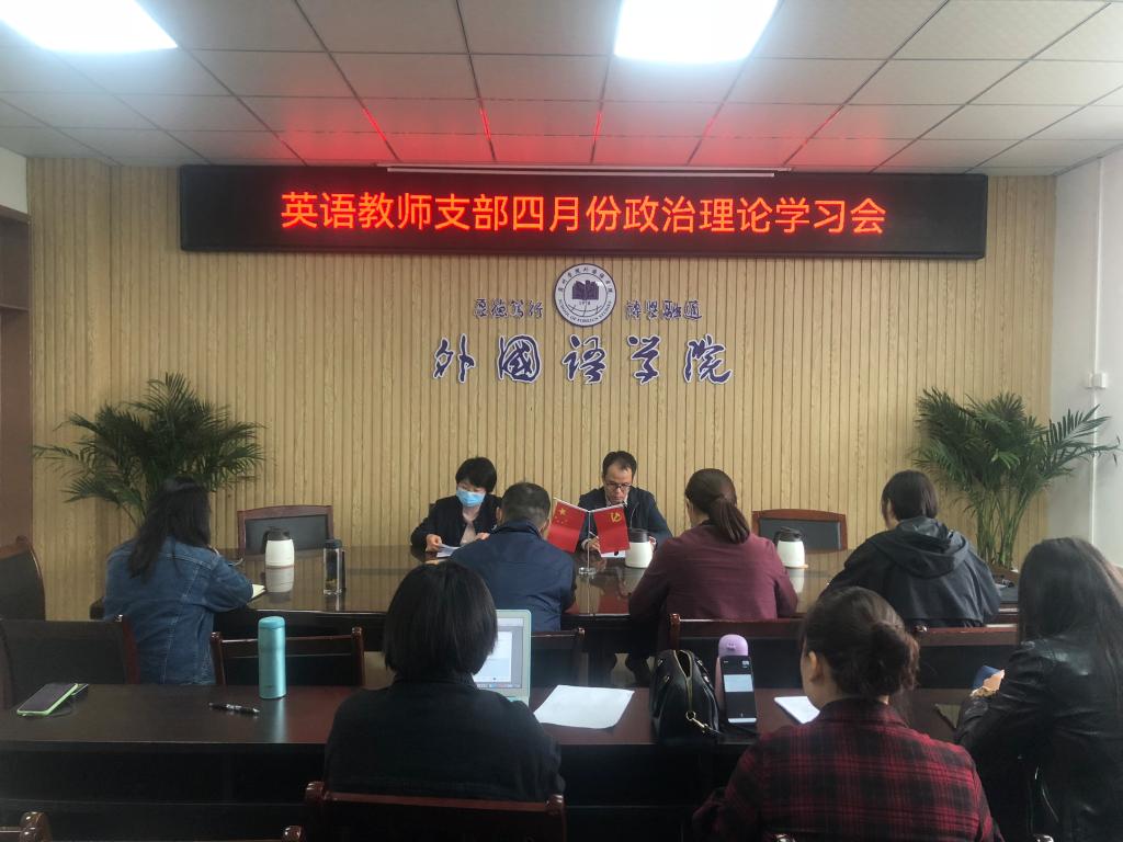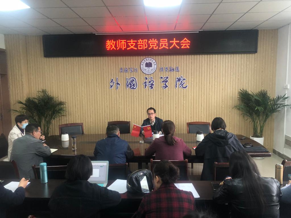 4月29日下午,外国语学院英语教师党支部在逸夫楼A318会议室召开全体党员大会,由于疫情原因,大会采取线上线下相结合的方式,会议由支部书记李小鹏主持。