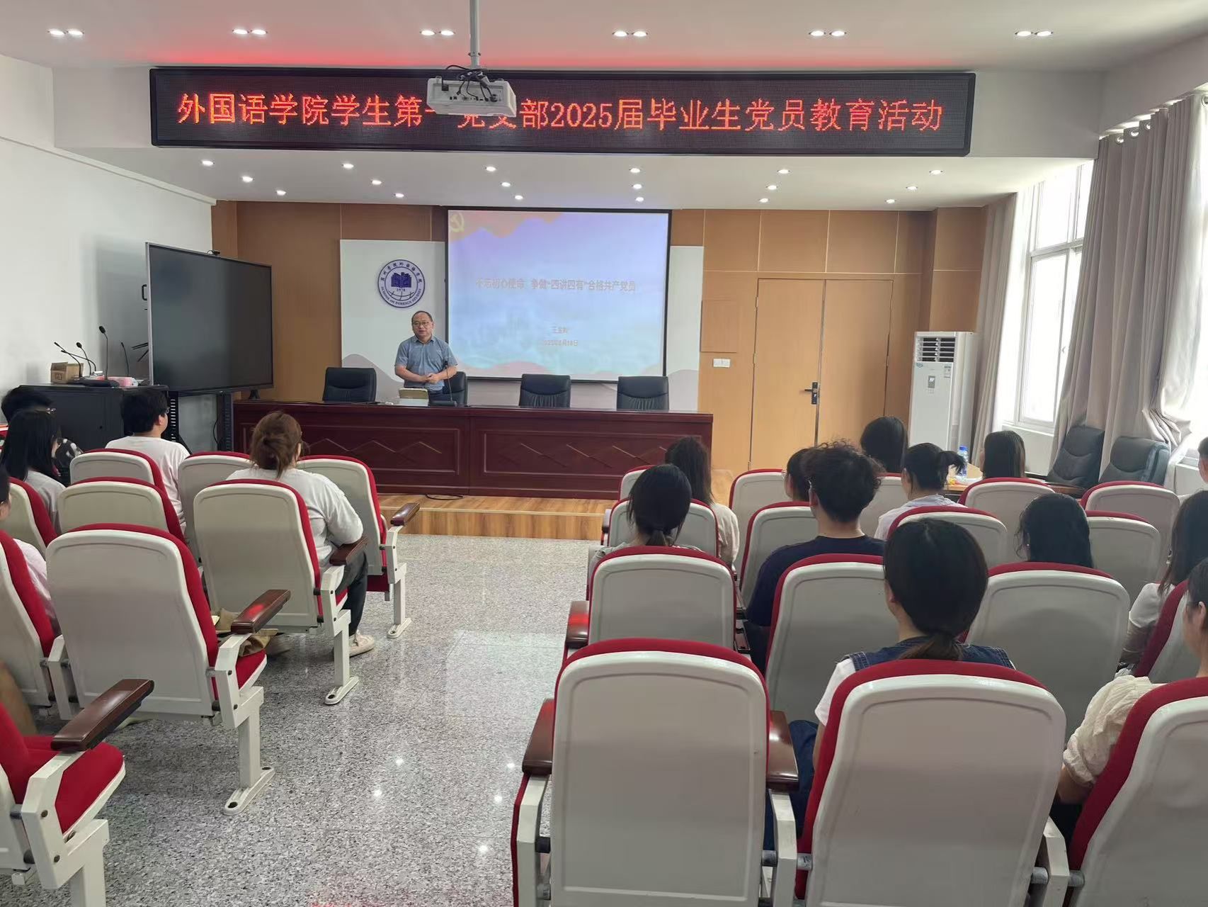 为引导毕业生党员坚定理想信念,强化党性修养,在人生新征程上永葆共产党员先进本色,6月18日,外国语学院学生第一党支部在逸夫楼一楼会议室举办毕业生党员主题教育活动。学院党委书记王金岭为即将踏上社会的毕业生党员们讲授了一堂专题党课。