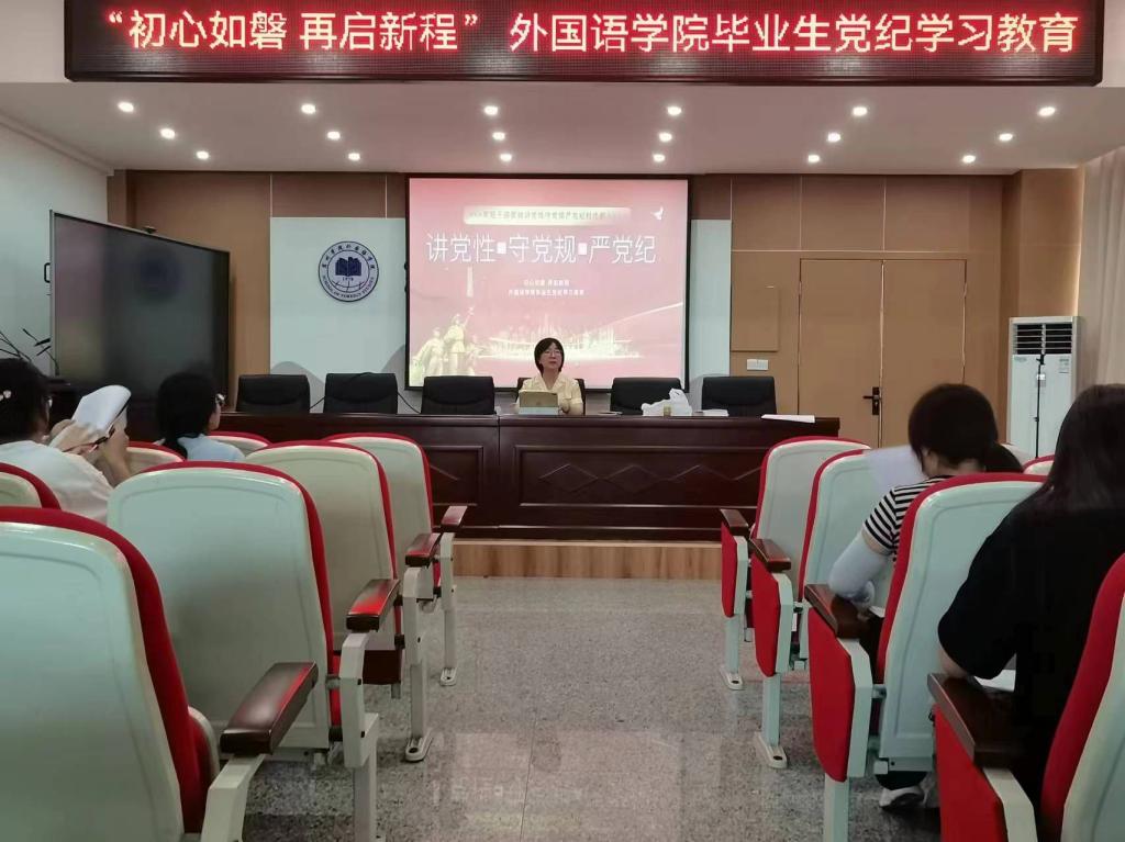 为引领毕业生党员坚定理想信念、筑牢思想防线,6月17日中午,外国语学院学生第一党支部书记赵婷婷在逸夫楼一楼会议室为即将走出校门的毕业生党员们讲授了一场题为“初心如磐 再启新程”的党纪学习教育专题党课。此次党课旨在加强毕业生党员的党性教育,引导他们在未来的工作和社会生活中,始终保持清正廉洁的政治本色。
