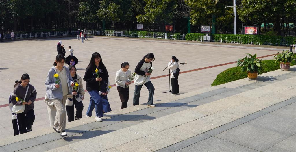 在党支部书记赵婷婷的带领下,学生代表整齐地列队,佩戴着党员徽章,怀着无比崇敬的心情,带着对革命先烈的敬仰到达烈士陵园,在烈士纪念碑前举行了庄重的祭扫仪式。他们默哀一分钟,让心灵在静谧中感受烈士们的英勇事迹,让精神在敬仰中汲取力量。同学们神情肃穆,手持鲜花,向烈士纪念碑鞠躬致敬,表达对烈士们的深深敬意和无尽怀念。