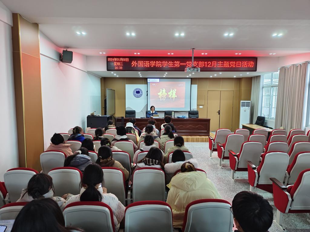 为加强党员思想政治教育,进一步弘扬正能量,强化使命担当,12月25日外国语学院学生第一党支部在逸夫楼一楼会议室开展主题党日活动,组织全体党员共同观看了专题片《榜样8》。