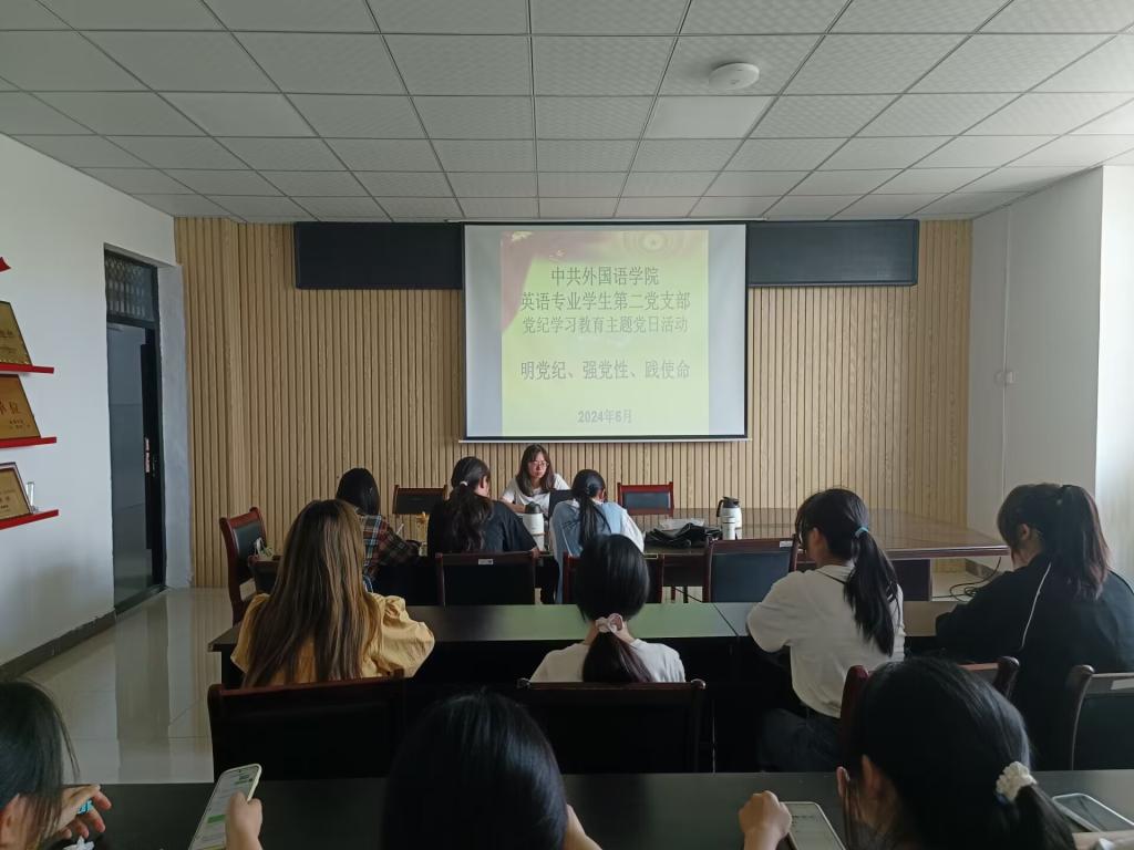 为了强化学生党员的纪律意识,提升党性修养,筑牢思想防线,引导广大学生党员加深对党纪的认识与理解。6月20日,中共外国语学院学生第二党支部书记余阳在逸夫楼A318以“明党纪、强党性、践使命”为主题给支部学生党员上党纪学习教育主题党日活动。
