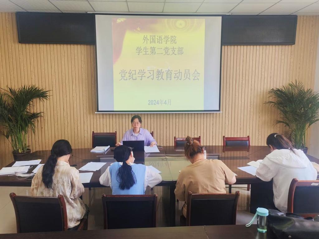 2024年4月17日,外国语学院学生第二党支部在A318会议室召开党纪学习教育动员会。会议由支部书记余阳主持,支部全体党员参加了此次动员会。