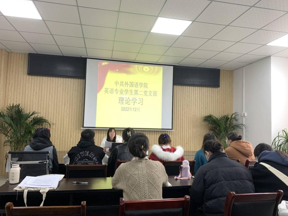 新时代新征程,新使命新任务。党的二十大报告提出了新时代新征程中国共产党人的使命任务,为了深刻学习理解其内涵,12月8日,外国语学院学生第二党支部在逸夫楼A318会议室开展二十大报告专题理论学习之中国式现代化,本次理论学习由第二党支部书记余阳主持。