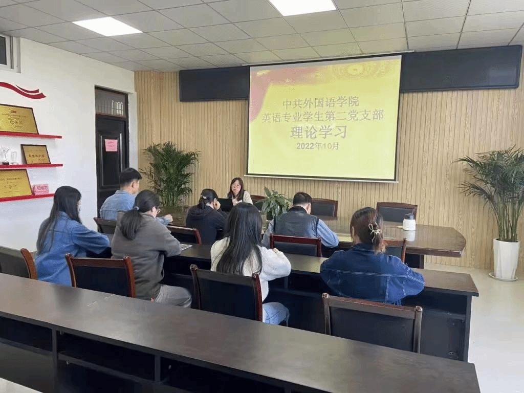 为深入学习宣传贯彻党的二十大精神,深刻领悟“两个确立”的决定性意义,全面掌握党的二十大提出的重要思想、重要观点、重大战略、重大举措,外国语学院学生第二党支部在党支部书记余阳的主持下于10月25日在逸夫楼A318开展了“学习宣传贯彻党的二十大精神”主题理论学习。