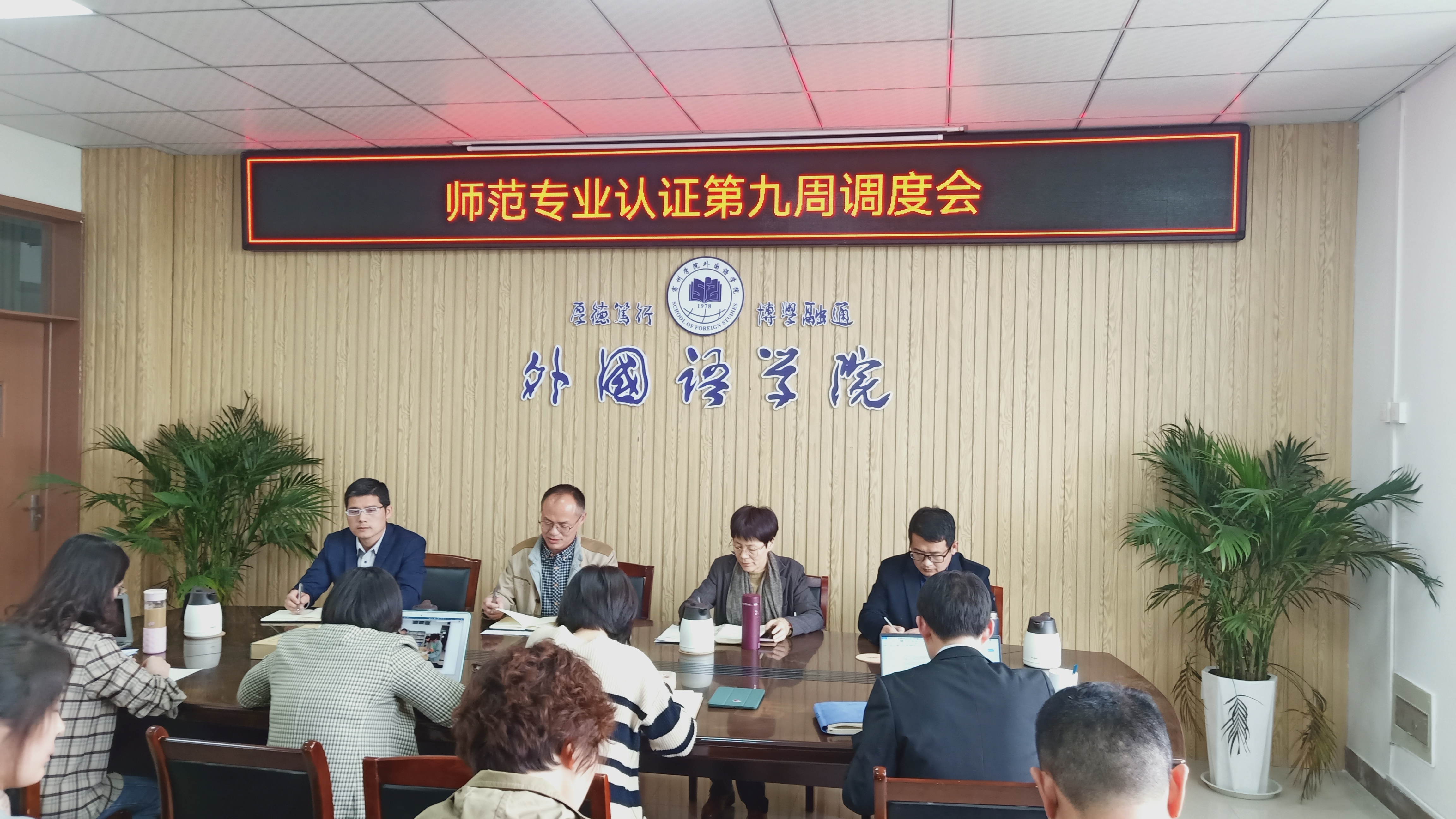 为推进师范专业认证工作,4月18日下午,外国语学院在逸夫楼A318会议室召开师范专业认证第九周调度会。外国语学院师范专业认证工作领导小组与各专项小组成员参加会议,院长张雁凌主持会议。