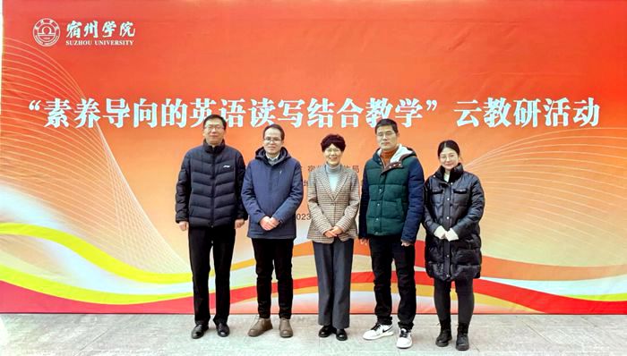 为进一步落实宿州学院英语师范教育基地建设,推进院-所-校教研合作体联合教研,12月21日下午,宿州学院英语师范教育基地联合宿州市教育体育局举办了“素质导向的英语读写教学”云教研活动。南京邮电大学刘艳教授、宿州市教育科学研究所所长刘远烈、宿州市教育科学研究所副所长侯姝琛、宿州市第一初级中学郭琦老师应邀参会。宿州市区中学英语教师代表和宿州市四县一区英语教师共3000余人通过线上线下相结合方式参会。宿州学院党委副书记王俊和宿州市教育体育局二级调研员佟涛出席开幕式并分别致辞。宿州学院英语师范教育基地所有成员参会。宿州学院英语师范教育基地负责人、宿州学院外国语学院党委副书记、院长张雁凌主持开幕式。