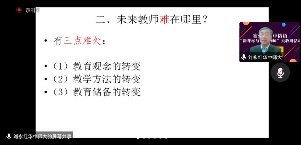 紧接着,刘永红教授作了题为《踔厉奋发育新人——俄语新课标研讨》的专题讲座,探讨了新课标新在哪里,未来教师难在哪里,实现途径在哪里等关键问题。