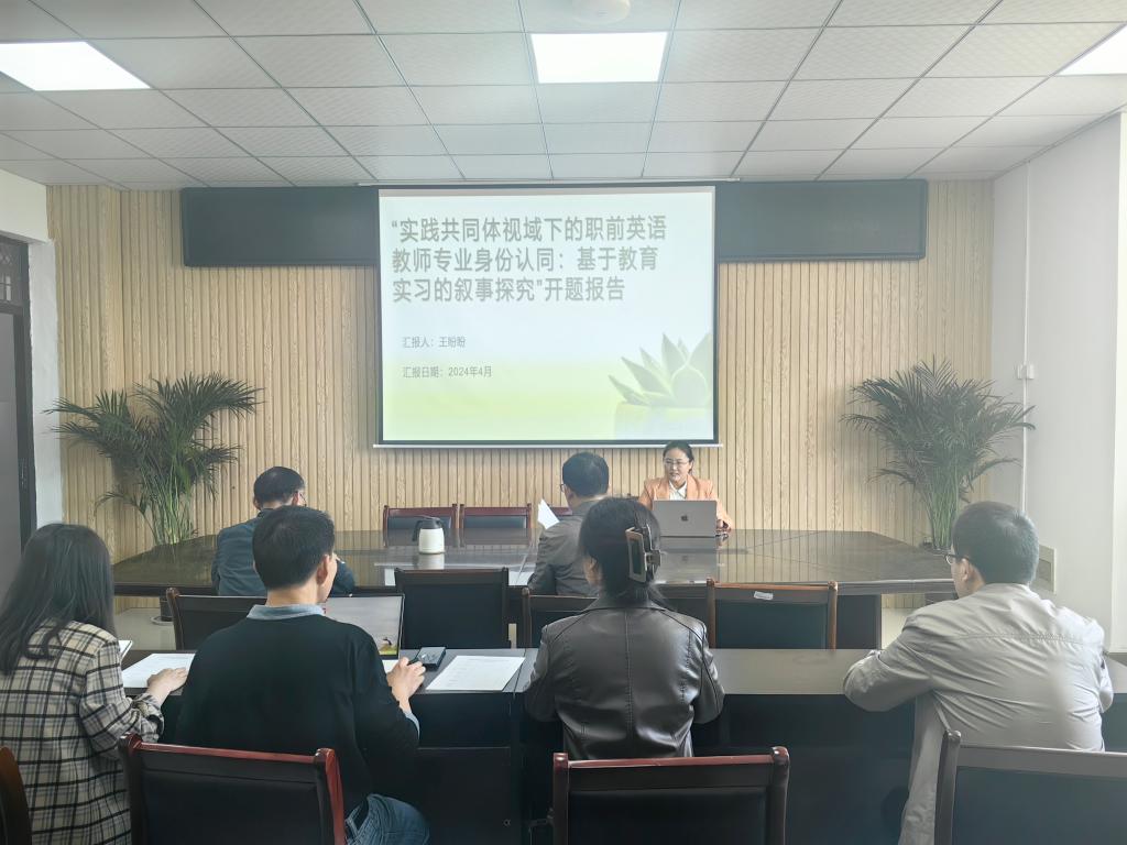项目主持人王盼盼代表项目组全体成员向参会专家详细介绍了“实践共同体视域下的职前英语教师专业身份认同:基于教育实习的叙事探究”项目的理论和实践意义、研究目的、研究内容、研究的重难点、研究方法、研究的技术路线和实施步骤、预期的主要研究成果等。专家们首先肯定了本项目的研究视角和研究意义,对开题报告的内容进行认真审议,对本项目的研究思路、研究成果等方面提出了宝贵的改进意见,对项目组的工作规划进行了具体指导。
