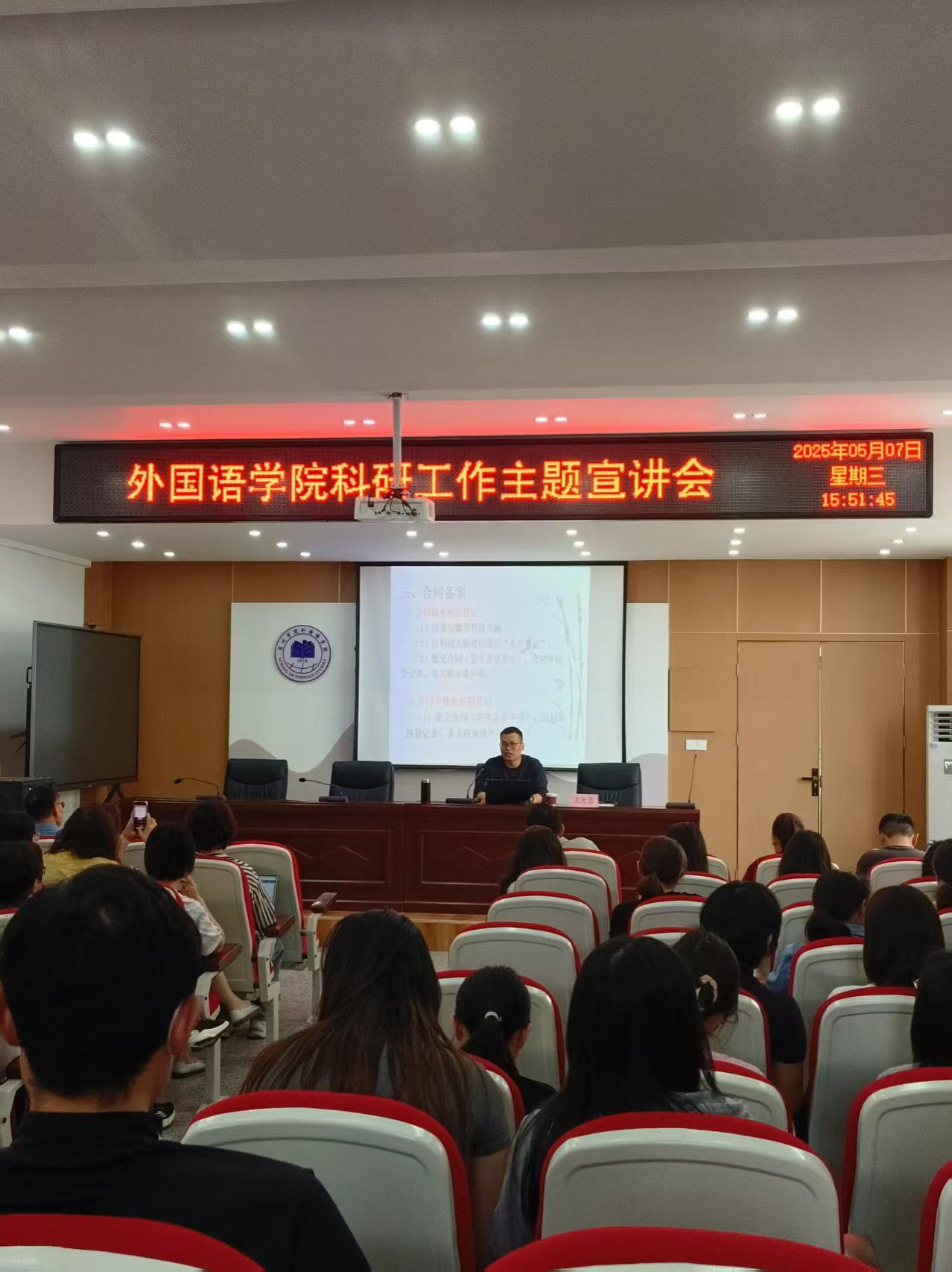 为进一步加深学院教师对学校科研政策的理解,更加全面、系统、准确地把握相关文件精神,5月7日下午,外国语学院邀请学校科研处王大雷老师在外国语学院一楼会议室进行科研政策宣讲,外国语学院全体教师参加了宣讲会。
