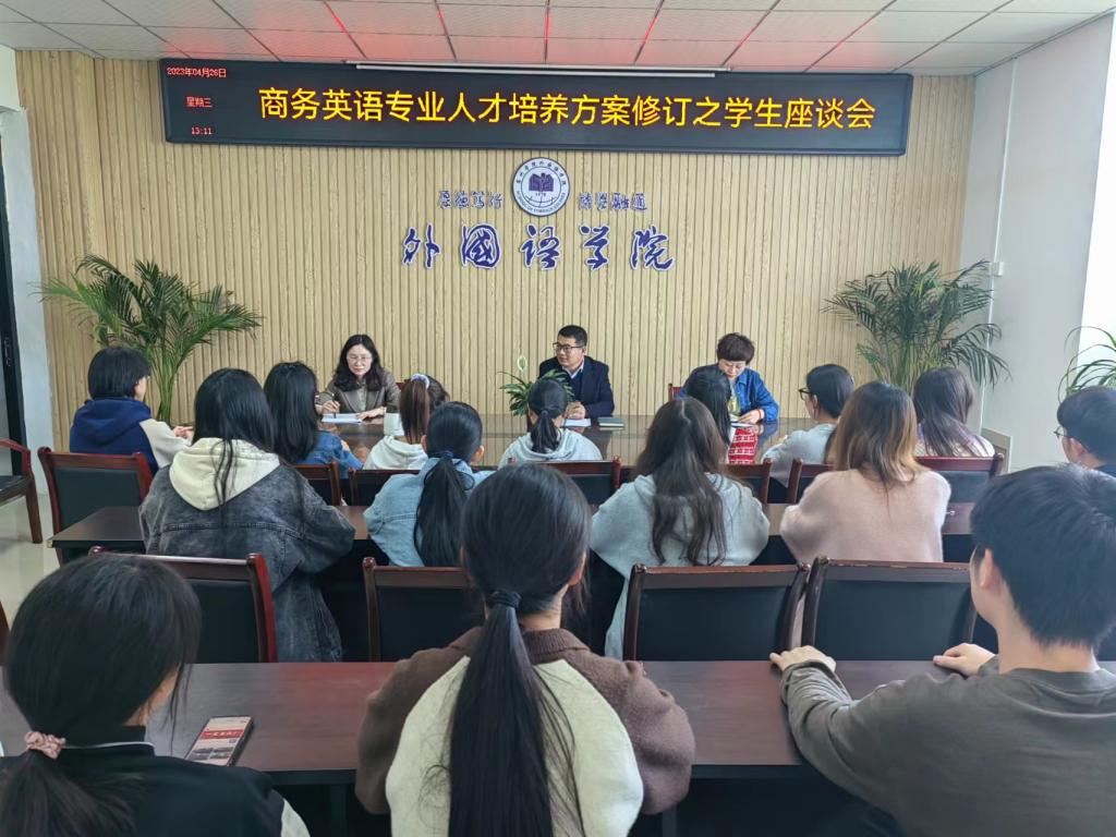 2023 年 4 月 26 日,应用英语教研室召开“商务英语专业人才培养方案修订学生座谈会”。座谈会由外国语学院科研副院长胡永近主持,应用英语教研室主任宗蔚、赵娟参加。